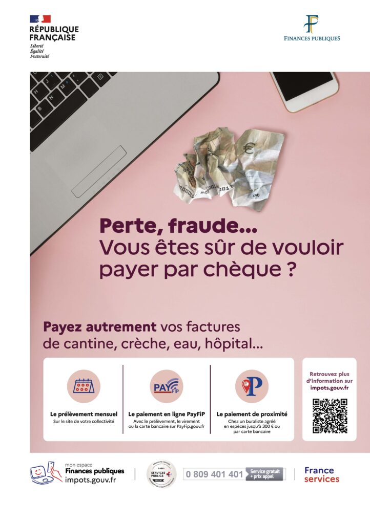 Suite à une note de la Direction générale des Finances publiques en date du 2 avril 2026 concernant la fin progressive du recouvrement par chèque des créances publiques, nous vous invitons à prendre connaissance de l’affiche ci-jointe.