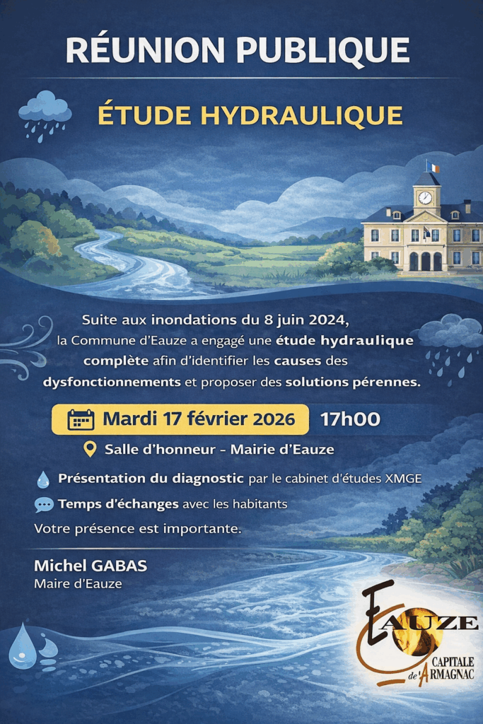 Suite aux inondations du 8 juin 2024, la Commune d’Eauze a engagé une étude hydraulique complète afin d’identifier les causes des dysfonctionnements et proposer des solutions pérennes.
