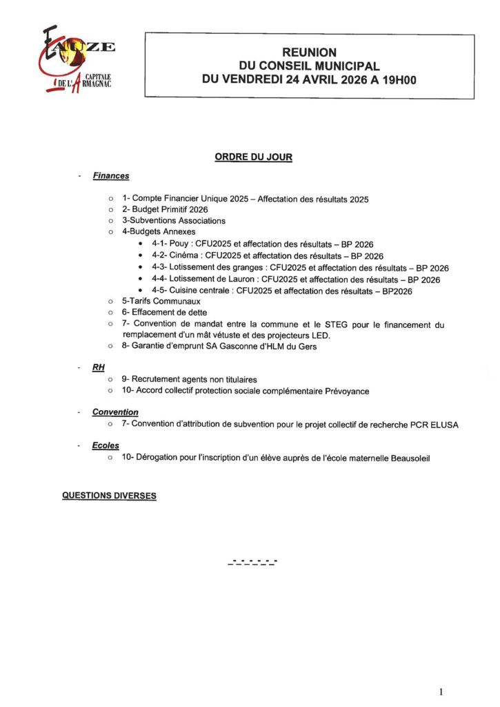 La prochaine réunion du conseil municipal se tiendra le vendredi 24 avril à 19h00, à la salle du Conseil Municipal (1er étage de la Mairie).